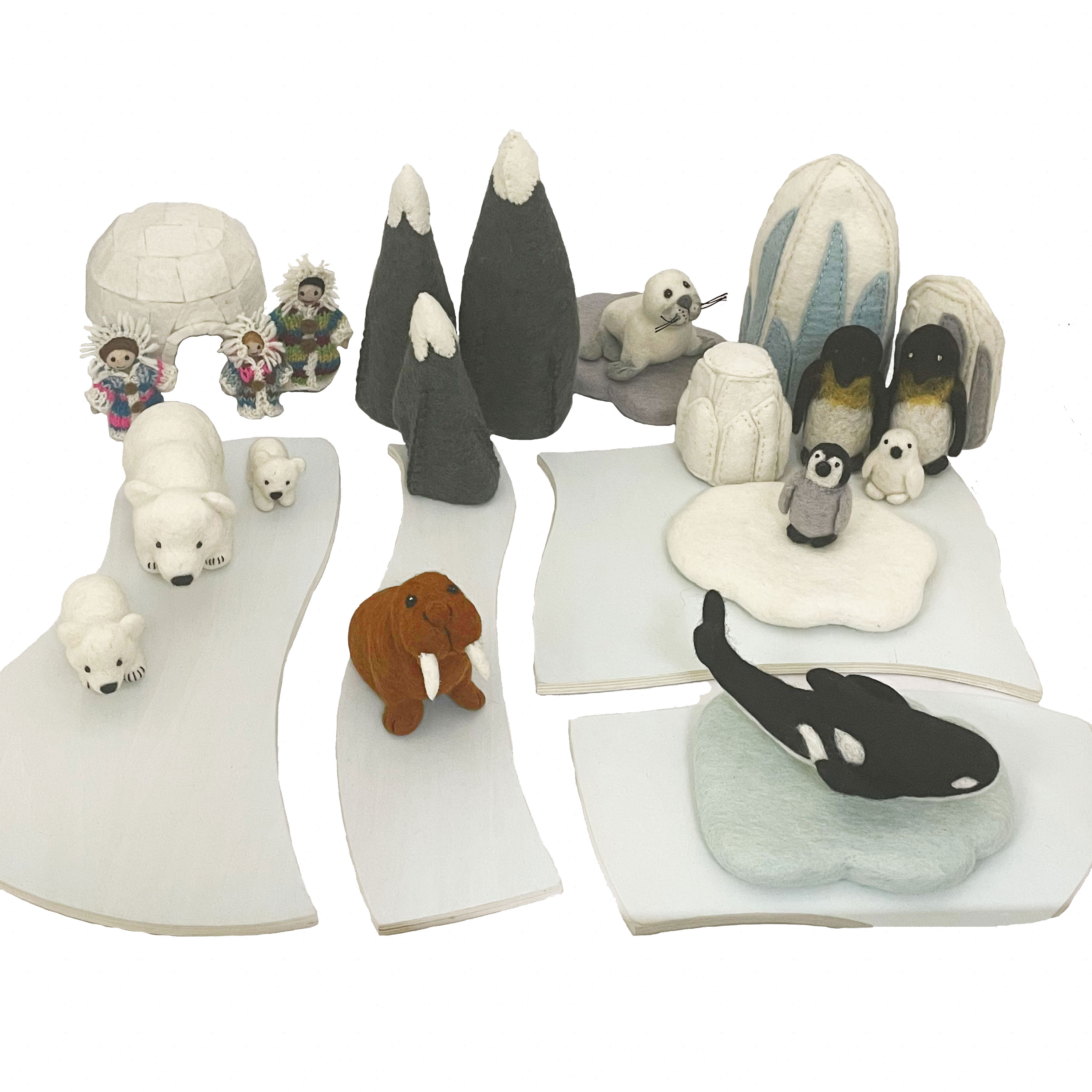 This charming Penguin family is handmade from 100% wool felt in Nepal and ready for icy adventures. With two adults and two chicks - one grey chick and one younger white chick still covered in baby down, this set invites storytelling, sorting and imaginative play.