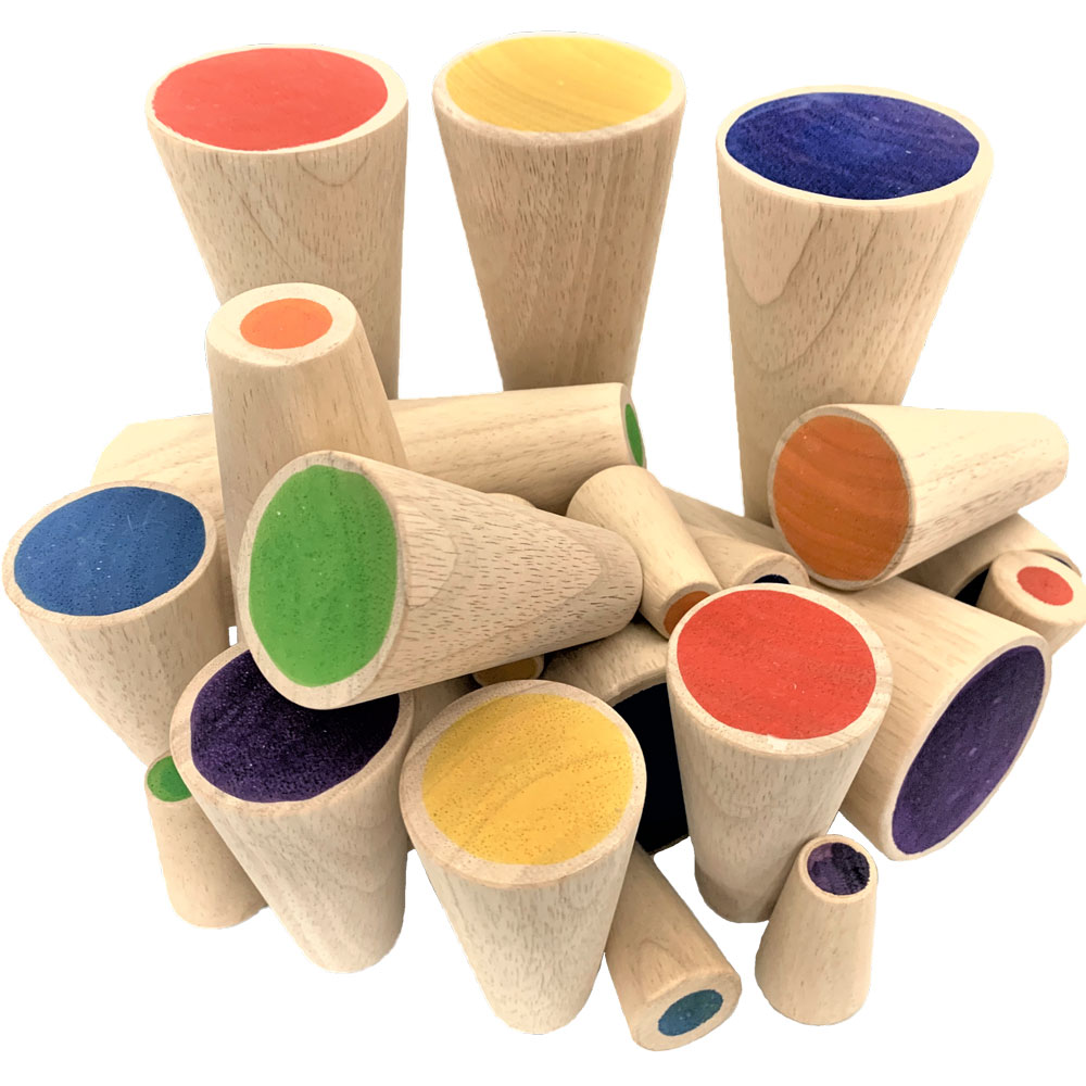 The cone shaped wooden totems are made from sustainable Rubber Wood and are hand painted top and bottom in Melbourne. There are 7 colours in this Rainbow range and each colour is represented in 3 sizes of the totems, small, medium & large.
