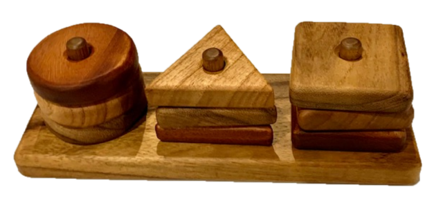The sturdy rectangular base includes three upright pegs, to hold all the shapes. With three pieces of each shape made from a variety of natural woods, children can enjoy subtle differences in texture and tone while practicing hand-eye coordination and problem-solving.