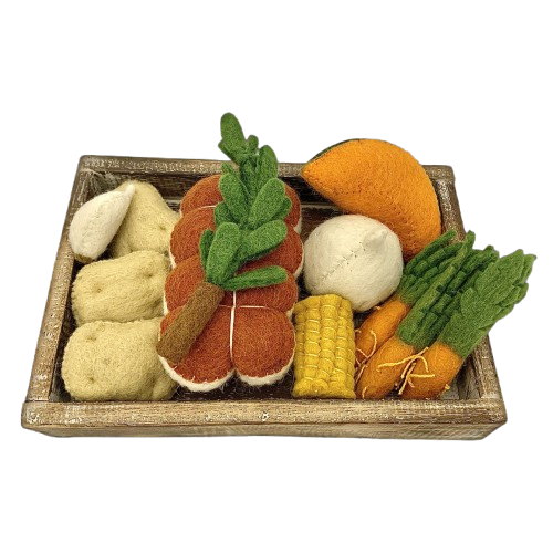 The roast is surrounded by yummy potato, garlic, pumpkin, carrots and corn, whilst the rosemary imparts a delicious aroma..... Presented in its own 'baking' tray, this is a gorgeous addition to the play kitchen.