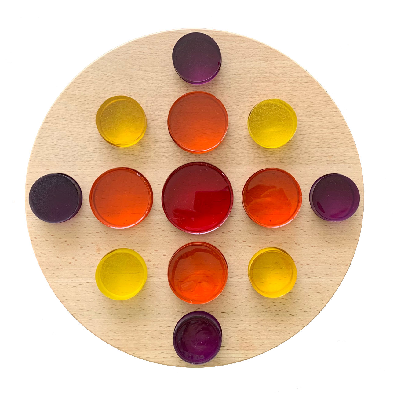 Children can stack, sort, and arrange the discs to explore patterns, colour mixing, and spatial relationships. Their smooth finish and radiant colours make them a tactile and visual delight.