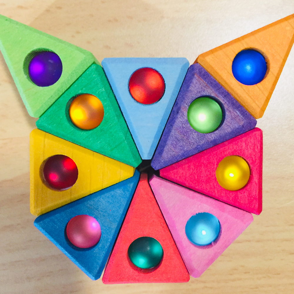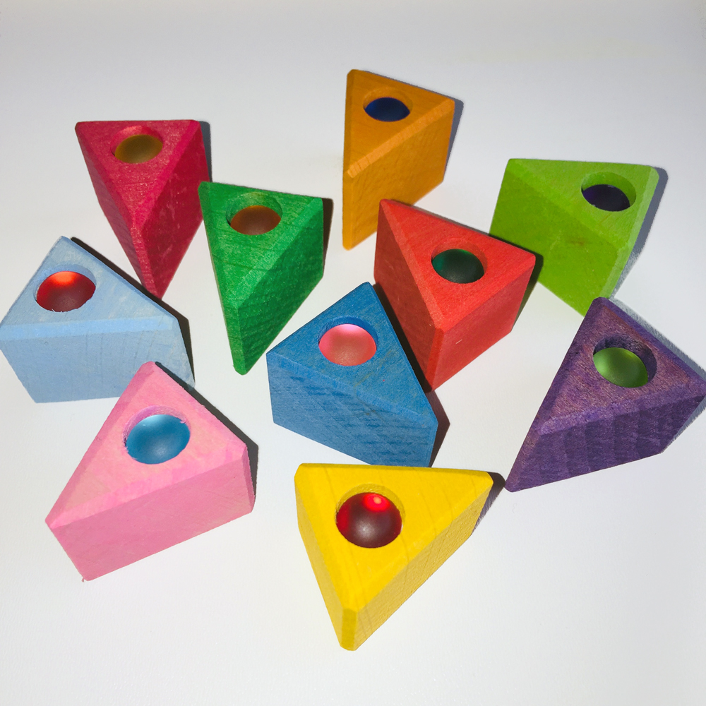 This set contains 10 pieces of Bauspiel Triangles to let little minds build and create. Each triangle is embellished with a little sparkling gem.