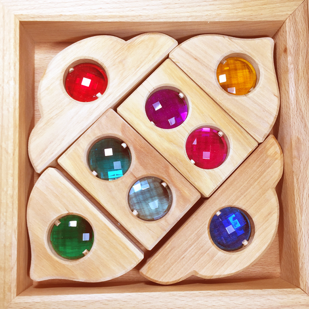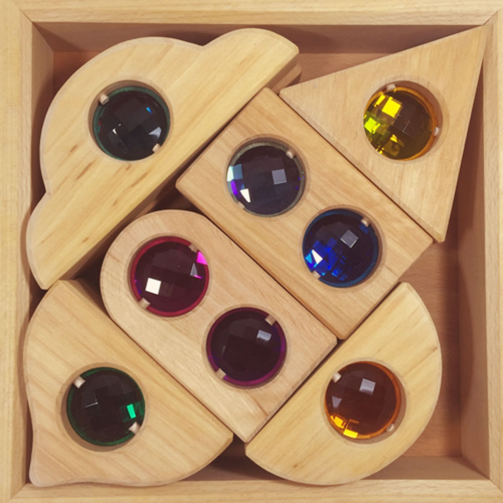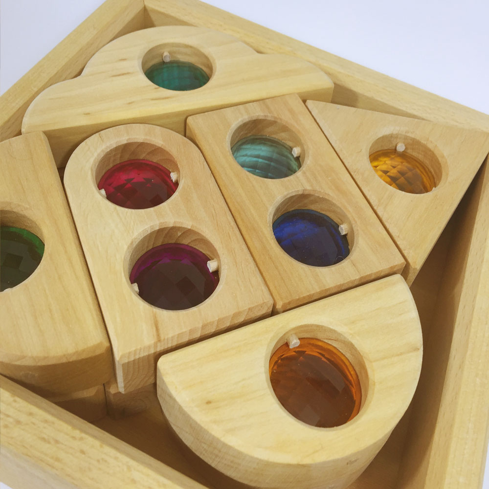 Each wooden window shape is embedded with see through coloured jewels which looks fantastic on a window ledge with the sun shining through and are a great light panel resource for discovering light and colour.