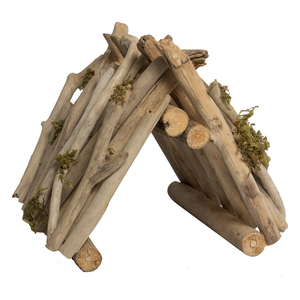 The woodland shelter is made up of 2 pieces from driftwood. They can be used individually as fencing or put together to form a shelter for animals, gnomes or fairies.