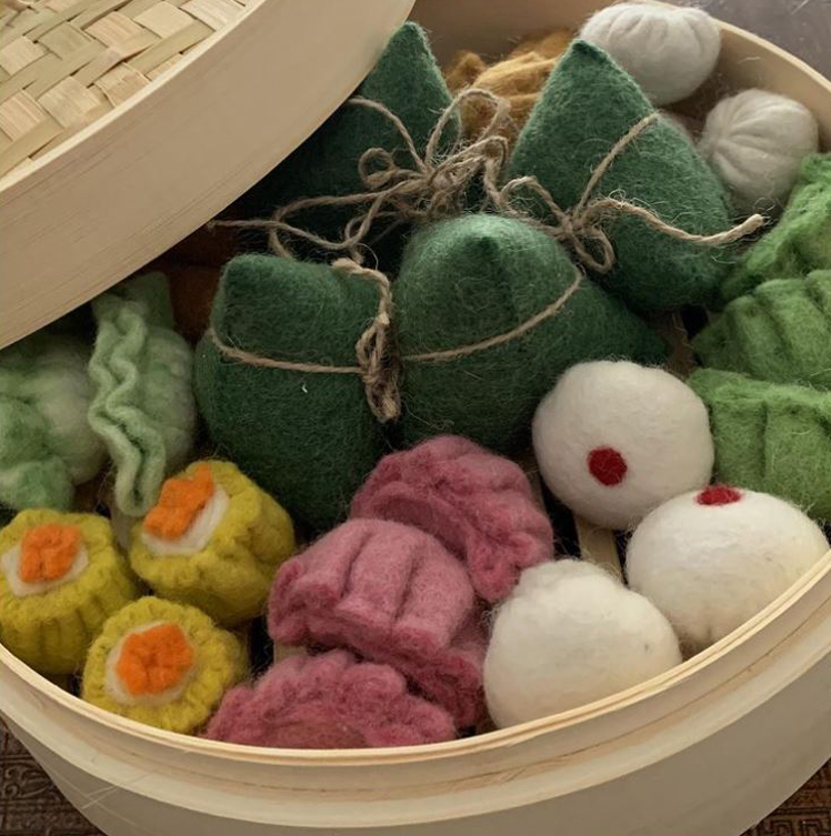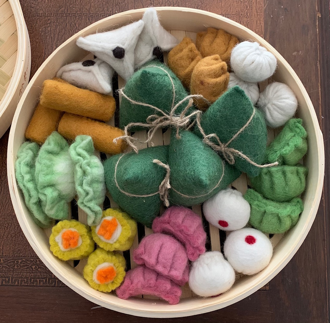 The food includes 4 Zhongzi, 3 Chunjuan, 3 Shaomai, 3 Baozi, 3 Tangsanjiao, 3 Mantou, 3 Green/White Jiaozi and 3 each Pink, Pumpkin and Green Jiaozi.